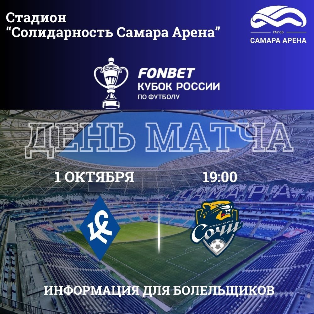 Сегодня на стадионе "Солидарность САмара Арена" пройдет матч 5 тура FONBET Кубка России по футболу Путь РПЛ. "Крылья Советов" принимают на домашнем газоне "Сочи".
