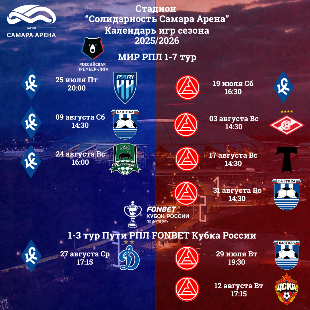 Друзья, знакомьтесь с летним расписанием домашних матчей команд «Крылья Советов» и «Акрон»!