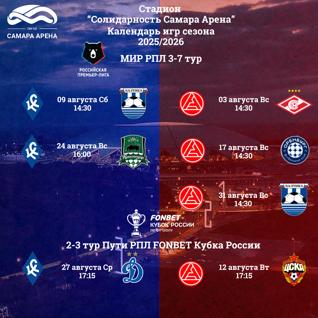 Сохраняйте расписание домашних игр ПФК «Крылья Советов» и ФК «Акрон», чтобы не пропустить ни одного матча.