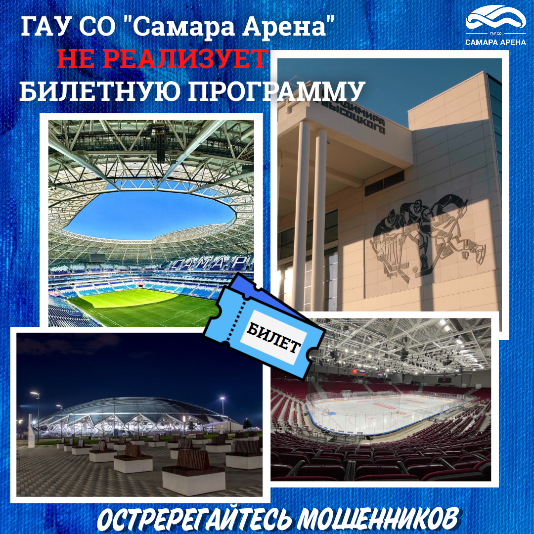 Напоминаем, ГАУ СО «Самара Арена» не реализует билетные программы на мероприятия, которые проходят на объектах спорта – стадионе «Солидарность Самара Арена» и в СКК «Дворец Спорта имени Владимира Высоцкого».
